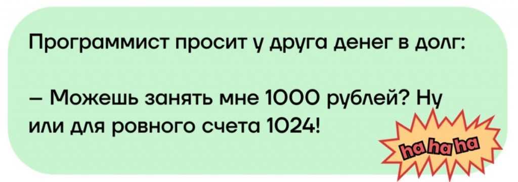 Поэтому нам, информатикам, неплохо бы знать степени двойки, как таблицу умножения, хотя бы до 10 степени. Это поможет избавить себя от постоянных перерасчетов одного и того же. А понадобятся они нам еще не раз: