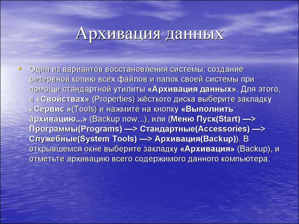 Цель архивирования заключается в том, чтобы сократить объем занимаемого места, уменьшить время доступа к данным и обеспечить их сохранность.