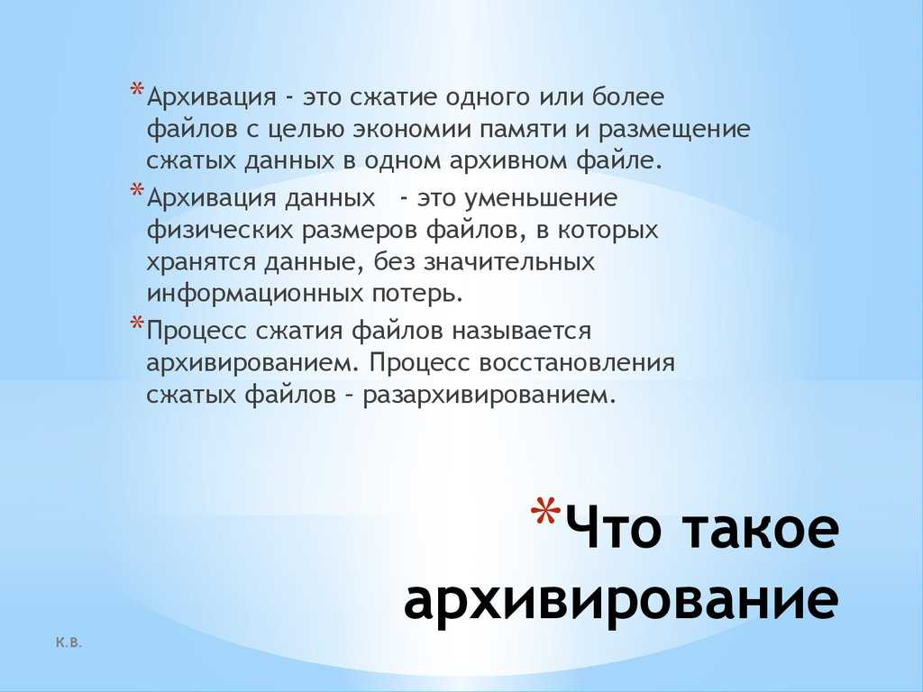Архивирование (упаковка, сжатие) это процесс записи файла в архивный файл, разархивирование (распаковка) — процесс извлечения файла из архива. Архив — упакованный (сжатый) файл. |