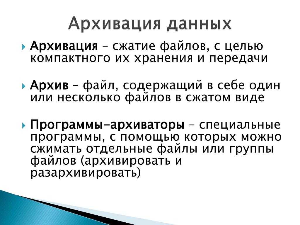 Архивирование — процесс перевода информации в компактный и сжатый формат для хранения или передачи по электронным коммуникационным каналам или другим средствам.