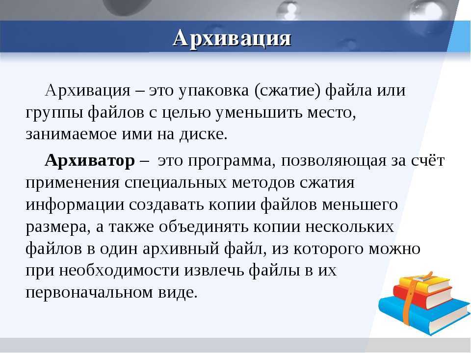 Действительно, зачем архивировать документы и папки? Архивацией называется процесс создания архива посредством упаковки файлов. Может происходить вместе со сжатием или без него.