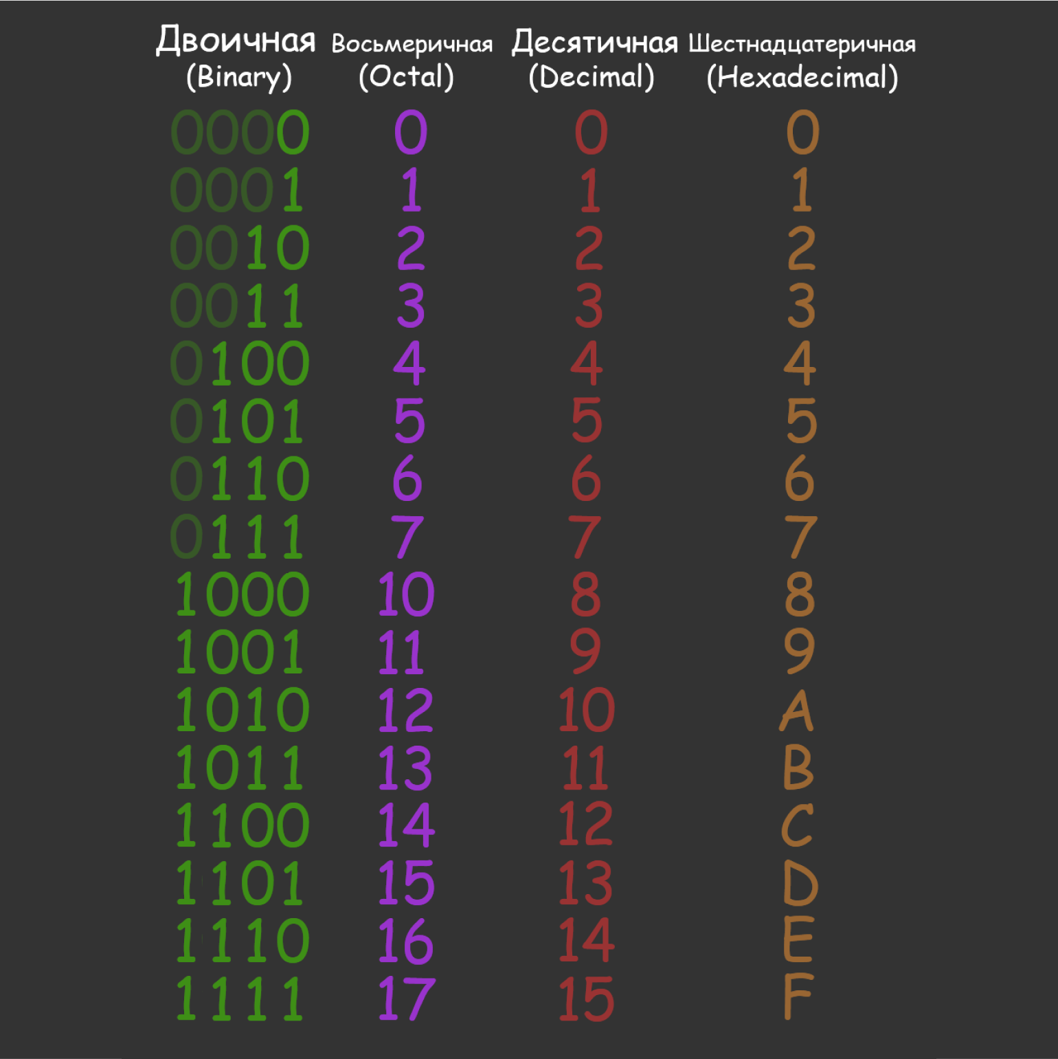 В следующей таблице приведены числа в двоичной системе (зелёный столбец) и соответствующие им числа в других часто используемых системах счисления — восьмеричной, десятичной и шестнадцатеричной.