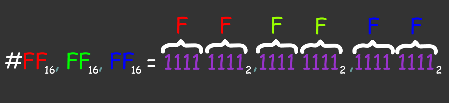 Длинная запись, неудобство с большими числами. Возьмём, к примеру, обозначение белого цвета в RGB-палитре: 25510, 25510, 25510 (здесь и далее нижний индекс указывает основание системы — двоичная, десятичная и так далее). Значения цветов принято записывать в шестнадцатеричной системе счисления (FF16, FF16, FF16). Если перевести это в бинарный вид, получится громоздко и непонятно: