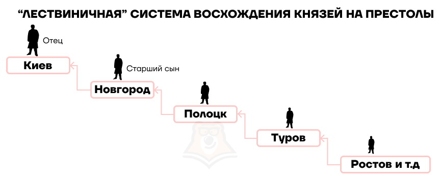 В Русской правде был прописан и закреплен лествичный порядок престолонаследия, то есть киевский престол доставался старшему мужчине в роду.
