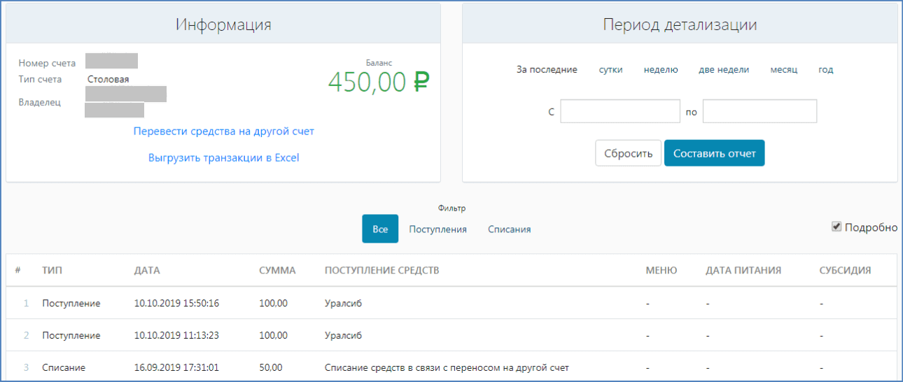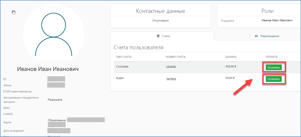 В этом разделе представлены данные номера счета и баланс пользователя. Можно оплатить питание детей в столовой или буфете, для этого нужно нажать кнопку «Оплатить». В появившемся окне заполнить все необходимые данные и выбрать способ оплаты.