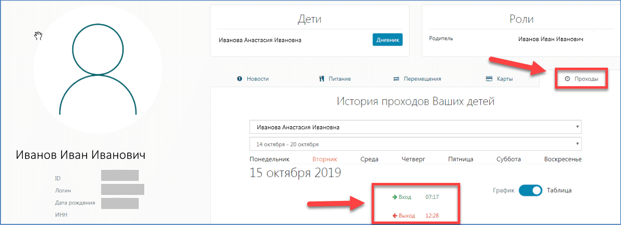 Если СКУД гимназии, лицея, общеобразовательной школы подключена к КИС «Образование», то в личном кабинете родителя появится информация о том, когда ребенок пришел на занятия. В этом же поле можно увидеть, когда школьник покинул здание.