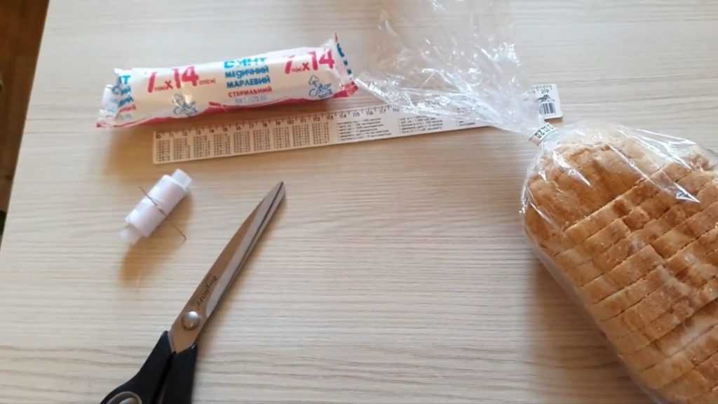 100 г гигиенической гигроскопической ваты; Нитка и иголка; Ножницы; 2 упаковки бинта, имеющих 7 метров в длину и 14 см ширину.