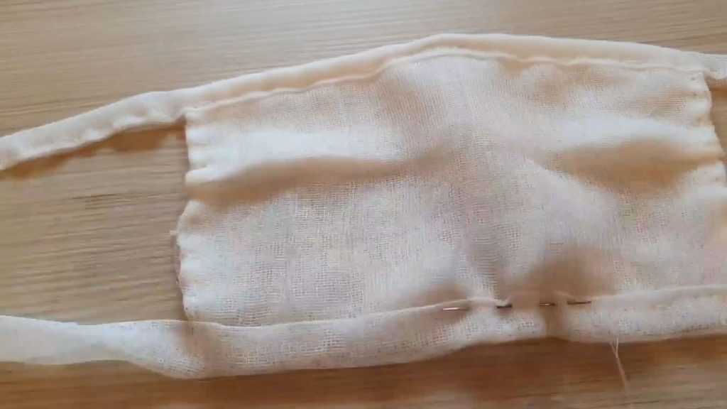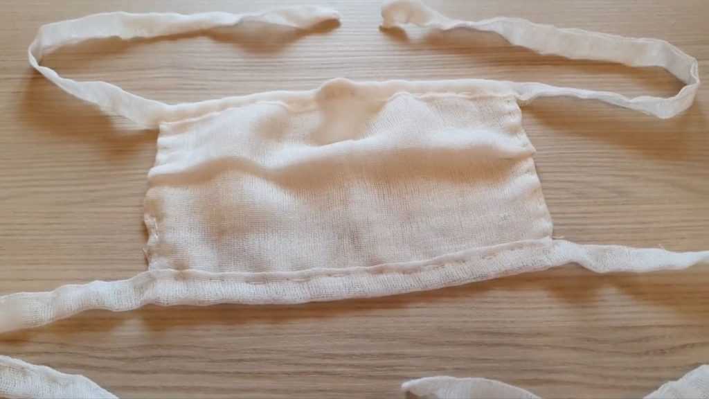 Если в доме нет марли, но есть в наличии широкий бинт, то самодельные маски вполне можно изготовить из него. Необходимо выбирать материал с плотностью в 36 г/м2, из натурального хлопка. Способ шитья маски из бинта: