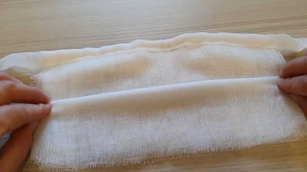 3. Теперь, загибаем часть марли, что ниже ваты доверху, а верхнюю часть донизу, таким образом, получаем вату в середине марли.