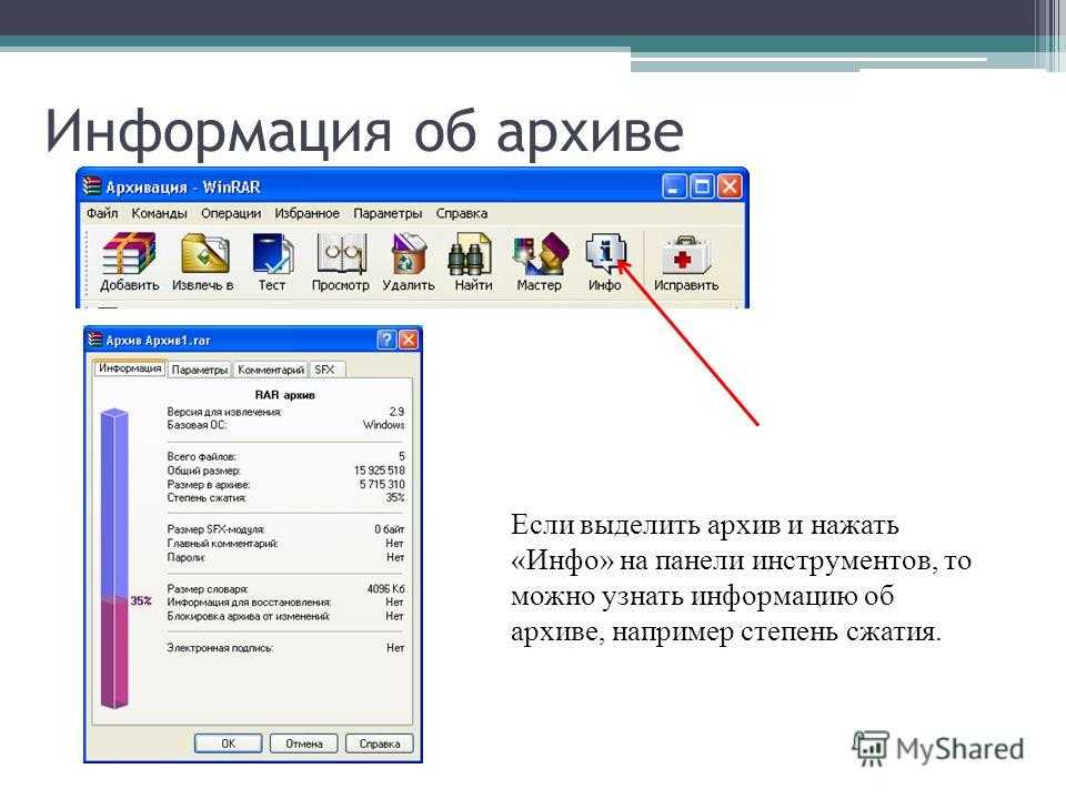 Информация об архиве Если выделить архив и нажать «Инфо» на панели инструментов, то можно узнать информацию об архиве, например степень сжатия.