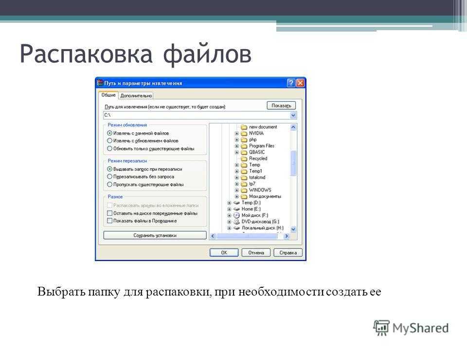 Распаковка файлов Выбрать папку для распаковки, при необходимости создать ее