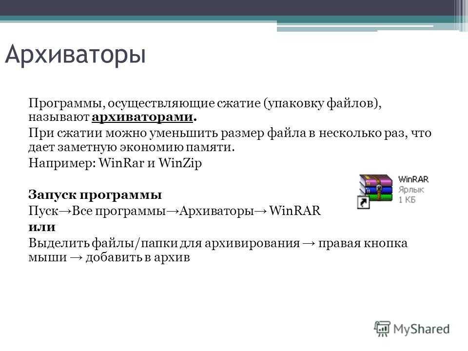 Архиваторы Программы, осуществляющие сжатие (упаковку файлов), называют архиваторами. При сжатии можно уменьшить размер файла в несколько раз, что дает заметную экономию памяти. Например: WinRar и WinZip Запуск программы Пуск Все программы Архиваторы WinRAR или Выделить файлы/папки для архивирования правая кнопка мыши добавить в архив