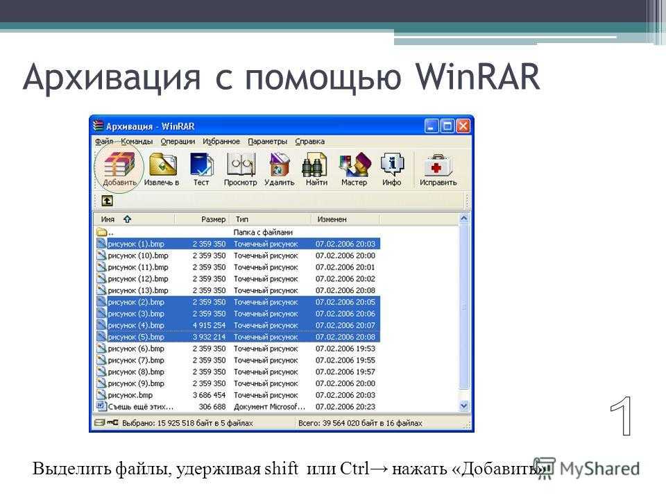 Архивация с помощью WinRAR Выделить файлы, удерживая shift или Ctrl нажать «Добавить»