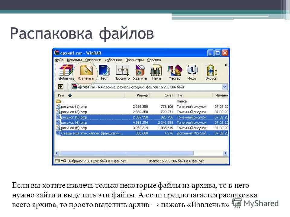 Распаковка файлов Если вы хотите извлечь только некоторые файлы из архива, то в него нужно зайти и выделить эти файлы. А если предполагается распаковка всего архива, то просто выделить архив нажать «Извлечь в»