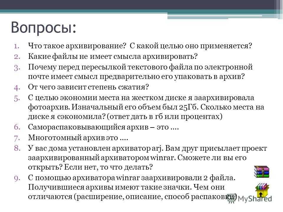 Вопросы: 1. Что такое архивирование? С какой целью оно применяется? 2. Какие файлы не имеет смысла архивировать? 3. Почему перед пересылкой текстового файла по электронной почте имеет смысл предварительно его упаковать в архив? 4. От чего зависит степень сжатия? 5. С целью экономии места на жестком диске я заархивировала фотоархив. Изначальный его объем был 25Гб. Сколько места на диске я сэкономила? (ответ дать в гб или процентах) 6. Самораспаковывающийся архив – это …. 7. Многотомный архив это …. 8. У вас дома установлен архиватор arj. Вам друг присылает проект заархивированный архиватором winrar. Сможете ли вы его открыть? Если нет, то что делать? 9. С помощью архиватора winrar заархивировали 2 файла. Получившиеся архивы имеют такие значки. Чем они отличаются (расширение, описание, способ распаковки)