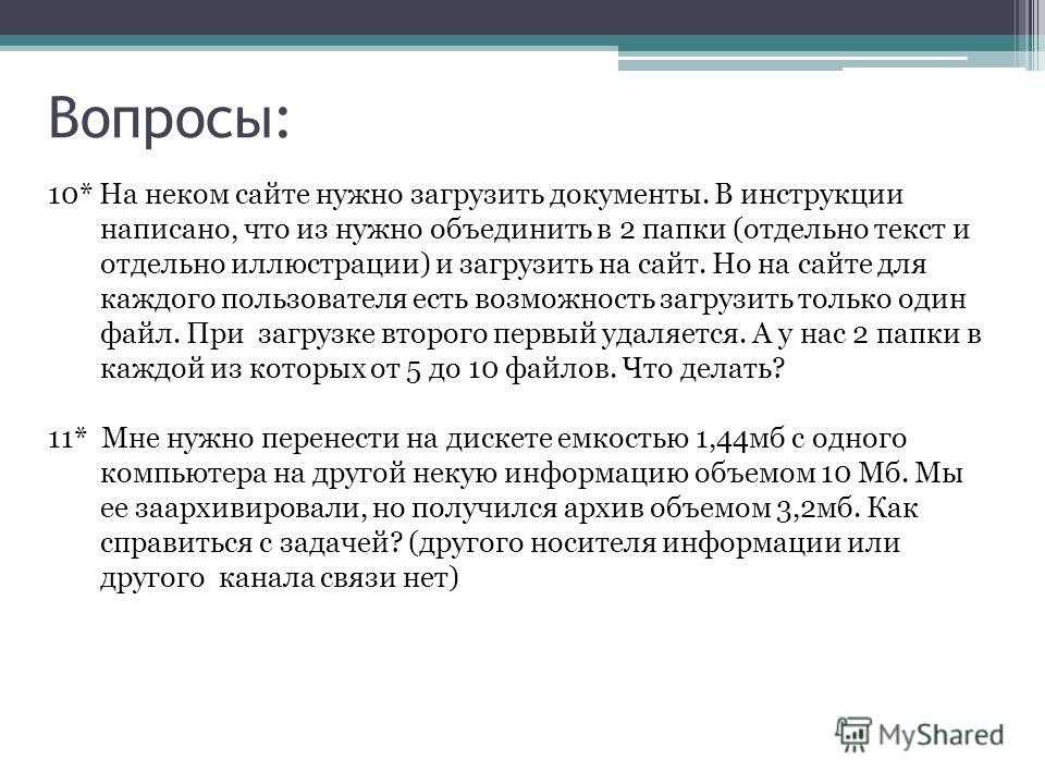 Вопросы: 10* На неком сайте нужно загрузить документы. В инструкции написано, что из нужно объединить в 2 папки (отдельно текст и отдельно иллюстрации) и загрузить на сайт. Но на сайте для каждого пользователя есть возможность загрузить только один файл. При загрузке второго первый удаляется. А у нас 2 папки в каждой из которых от 5 до 10 файлов. Что делать? 11* Мне нужно перенести на дискете емкостью 1,44 мб с одного компьютера на другой некую информацию объемом 10 Мб. Мы ее заархивировали, но получился архив объемом 3,2 мб. Как справиться с задачей? (другого носителя информации или другого канала связи нет)