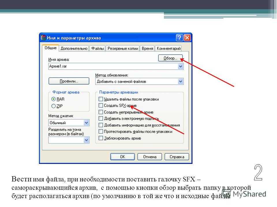 Вести имя файла, при необходимости поставить галочку SFX – самораскрывающийся архив, с помощью кнопки обзор выбрать папку в которой будет располагаться архив (по умолчанию в той же что и исходные файлы