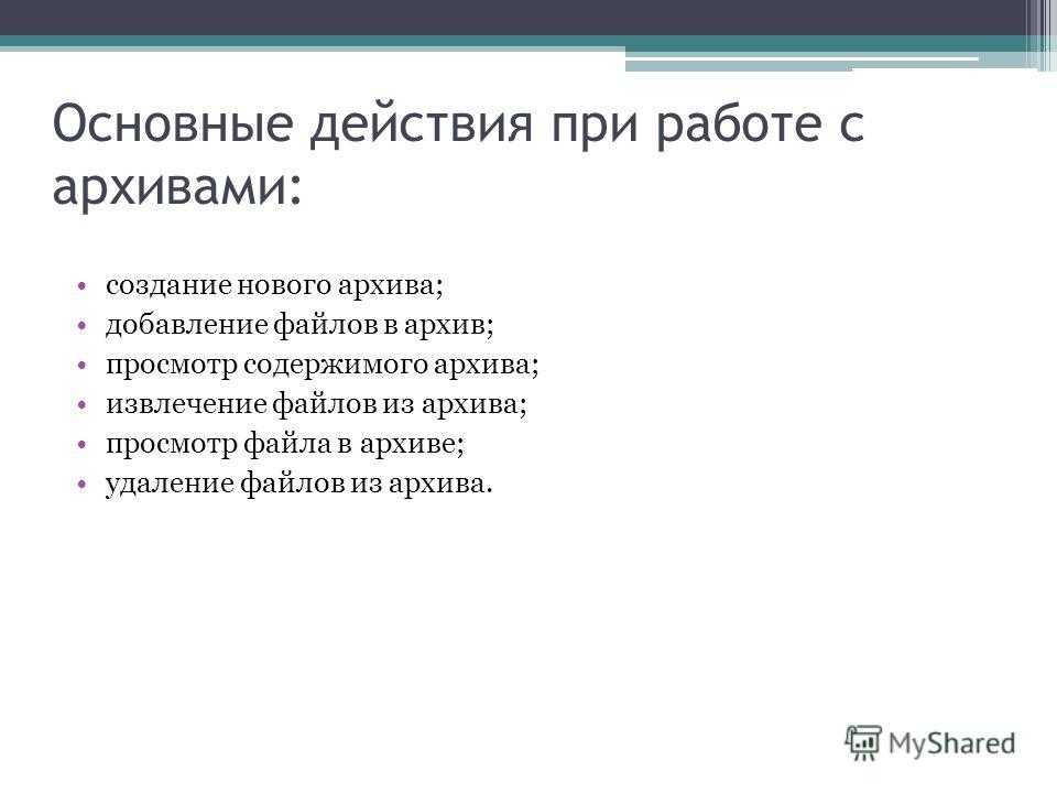 Основные действия при работе с архивами: создание нового архива; добавление файлов в архив; просмотр содержимого архива; извлечение файлов из архива; просмотр файла в архиве; удаление файлов из архива.