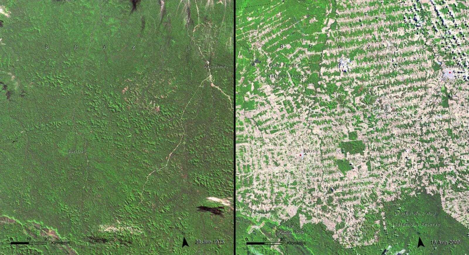 Ниже представлено фото из космоса, на которых отчетливо видно, как в Бразилии уменьшилось количество лесных массивов. На левой половине можно увидеть, как страна выглядела раньше, и на правой, как дело с количеством деревьев обстоит сейчас.