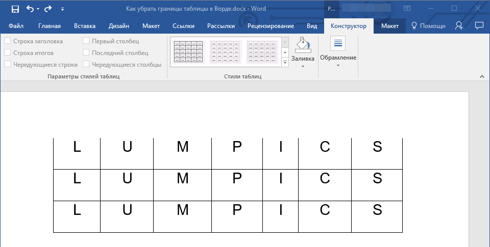 Делаем таблицу невидимой с помощью кнопки «Границы». После того, как таблица выделена, нужно перейти на вкладку «Конструктор» и нажать на стрелочку рядом с кнопкой «Границы». В открывшемся меню нужно выбрать вариант «Нет границ». После чего выделенная вами таблица должна стать невидимой.