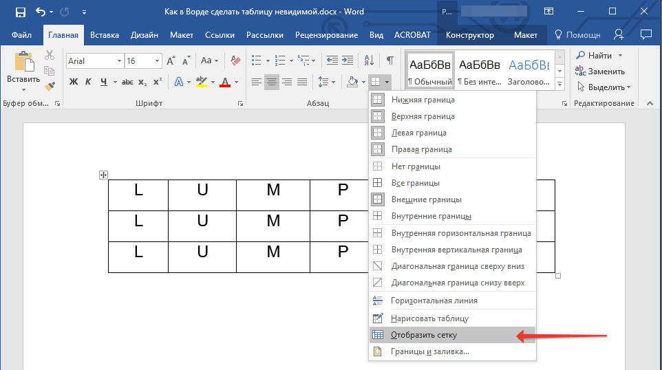 Важно: Прежде, чем приступить к скрытию границ таблицы, в MS Word необходимо включить параметр отображения сетки, так как в противном случае работать с таблицей станет очень сложно. Сделать это можно следующим образом