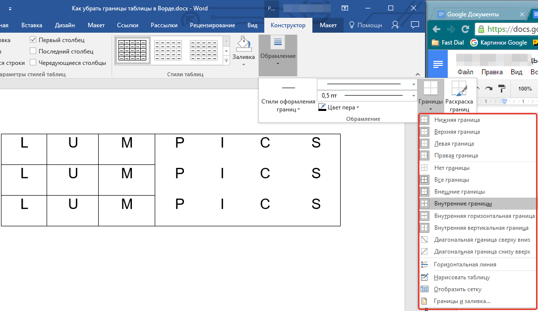 Примечание: Если вы кликните такой кистью по концу любой из внешних границ таблицы, она исчезнет полностью. Внутренние границы, обрамляющие ячейки, будут удаляться каждая отдельно.