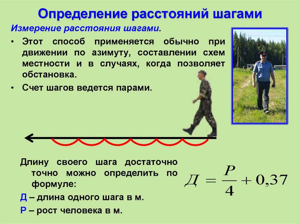 При движении по азимутам расстояние удобно измерять парами шагов. Для человека среднего роста каждую пару шагов принимают за 1,5 м. Более точно длину своего шага можно определить по измеренному или известному расстоянию на местности.