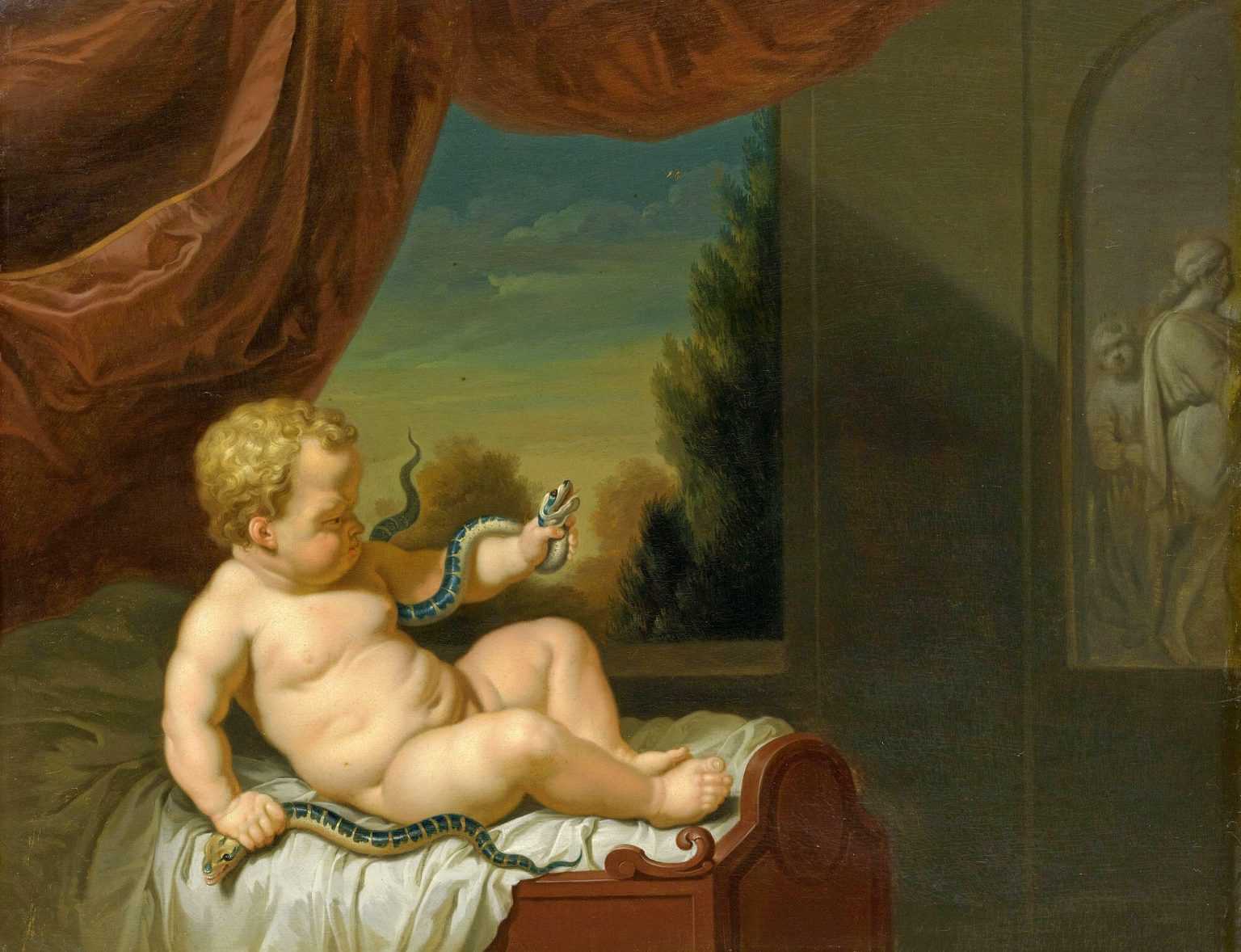 Однажды маленький Геракл спал в колыбели рядом со своим братом. В этот момент к ним подползли две змеи, что хотели ужалить малышей. Почувствовав опасность, кроха Геракл проснулся и схватил ручками двух рептилий. Несмотря на столь нежный возраст, в его руках уже скрывалась недетская сила. Геракл задушил двух змей, чем вызвал потрясение своих родных.