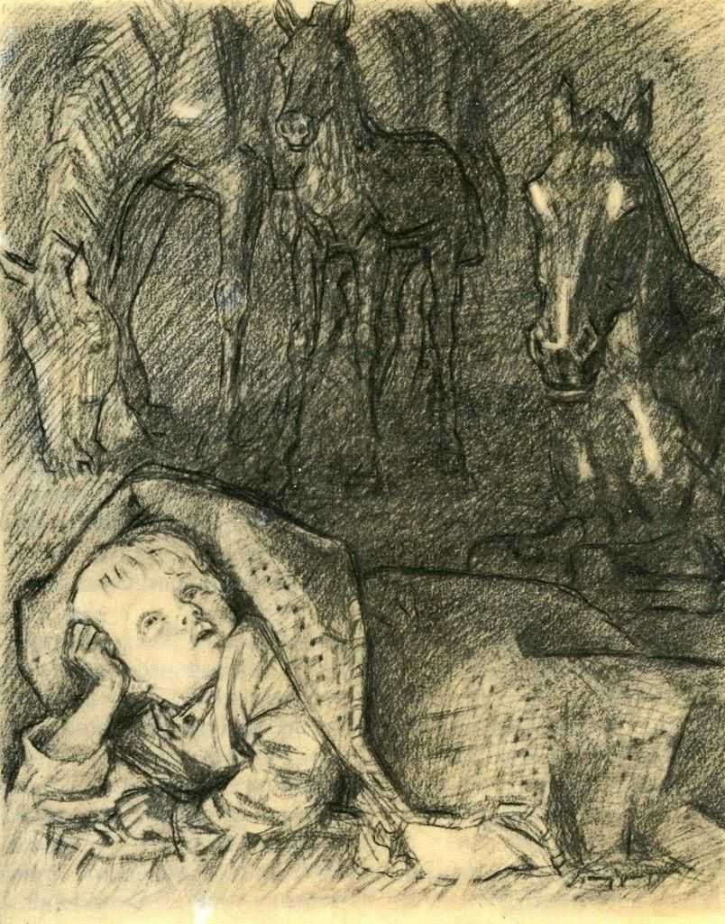 Охотник спустился к костру, его не очень дружелюбно встретили две собаки, которых быстро успокоили подоспевшие мальчишки. У костра сидели юные деревенские пастухи, которые стерегли табун лошадей. Рассказчик сказал мальчишкам, что заблудился и остался с ними до утра.