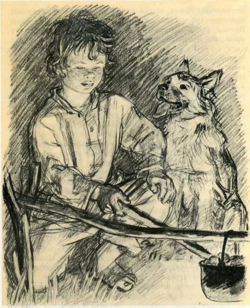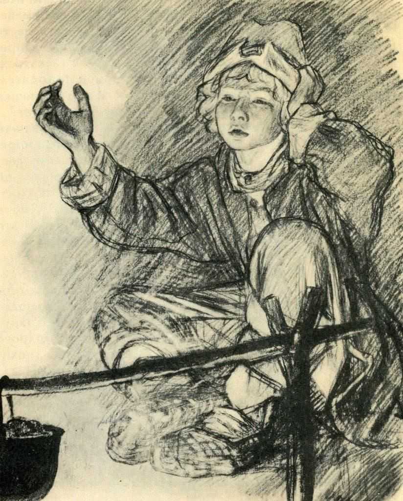 Всего было пятеро ребят: старший Федя, Павлуша, Илюша, Костя и самый маленький Ваня. Над костром висел котелок, в котором варились «картошки». Когда мальчишки решили, что их случайный гость уснул, они возобновили беседу.