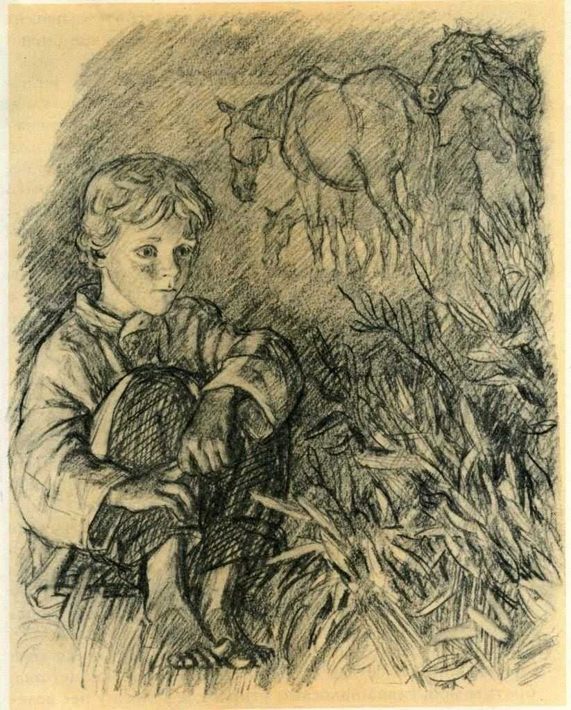 Расположившись у костра, рассказчик принялся рассматривать мальчиков, самому старшему из которых – Феде – было всего четырнадцать лет. Было видно, что он из зажиточной семьи и выехал ночью в поле не по нужде, а лишь за компанию с другими ребятами