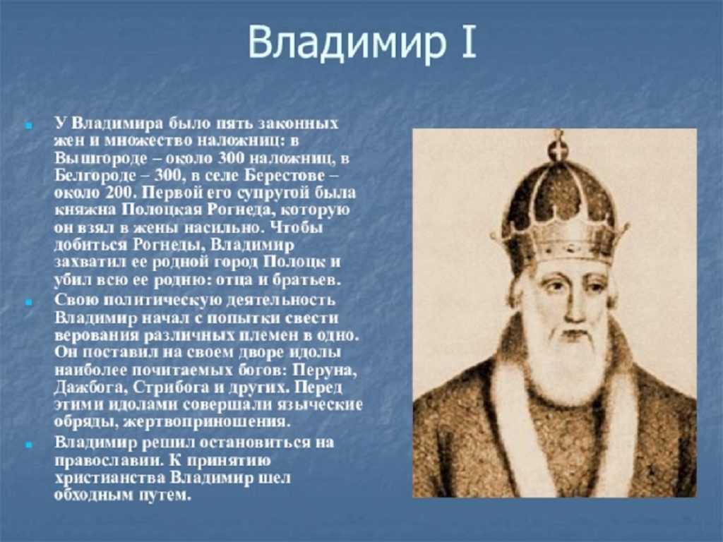 Для дальнейшего становления Киевской Руси как державы потребовались и преобразования в религиозной сфере. Нужна была новая государственная религия. Сам же Владимир по вероисповеданию был язычником, по некоторым данным, у него было 5 жен и множество наложниц.