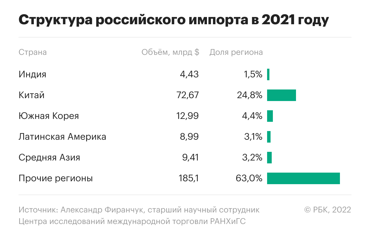 Отдельно стоит отметить Иран, чей экспорт в Россию за 2022 год увеличился на 73%. Можно предположить, что на фоне введения санкций Иран будет становиться все более важным экспортным хабом для России, в том числе для возможного обхода санкций. Есть также много слухов на тему того, что Россия может направить свои финансовые потоки на Ближний Восток, наладив сотрудничество с банками стран Персидского залива.