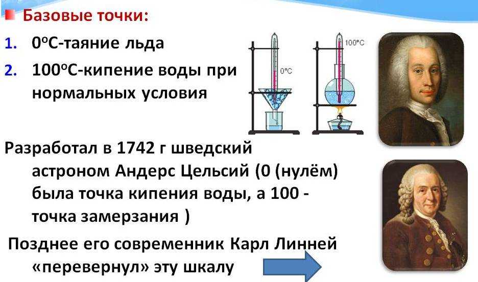 Существуют разные температурные шкалы. Одной из наиболее распространённых в практике шкал является шкала Цельсия. Основными точками этой шкалы служат температура таяния льда и температура кипения воды при нормальном атмосферном давлении (760 мм рт. ст.). Первой точке приписали значение 0 °С, а второй — 100 °С. Расстояние между этими точками разделили на 100 равных частей и получили шкалу, называемую шкала Цельсия. За единицу температуры по этой шкале принят 1 °С.