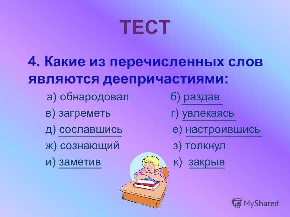 ТЕСТ 2. С чем можно согласиться? а) Деепричастие обозначает признак предмета. б) Деепричастие обозначает признак предмета по действию. в) Деепричастие обозначает добавочное действие предмета.