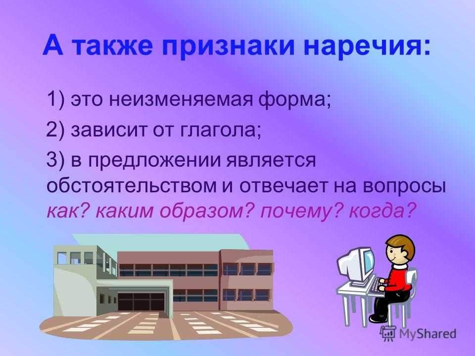 А также признаки наречия: 1) это неизменяемая форма; 2) зависит от глагола; 3) в предложении является обстоятельством и отвечает на вопросы как? каким образом? почему? когда?