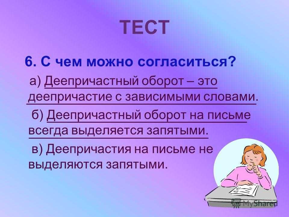 ТЕСТ 6. С чем можно согласиться? а) Деепричастный оборот – это деепричастие с зависимыми словами. б) Деепричастный оборот на письме всегда выделяется запятыми. в) Деепричастия на письме не выделяются запятыми.