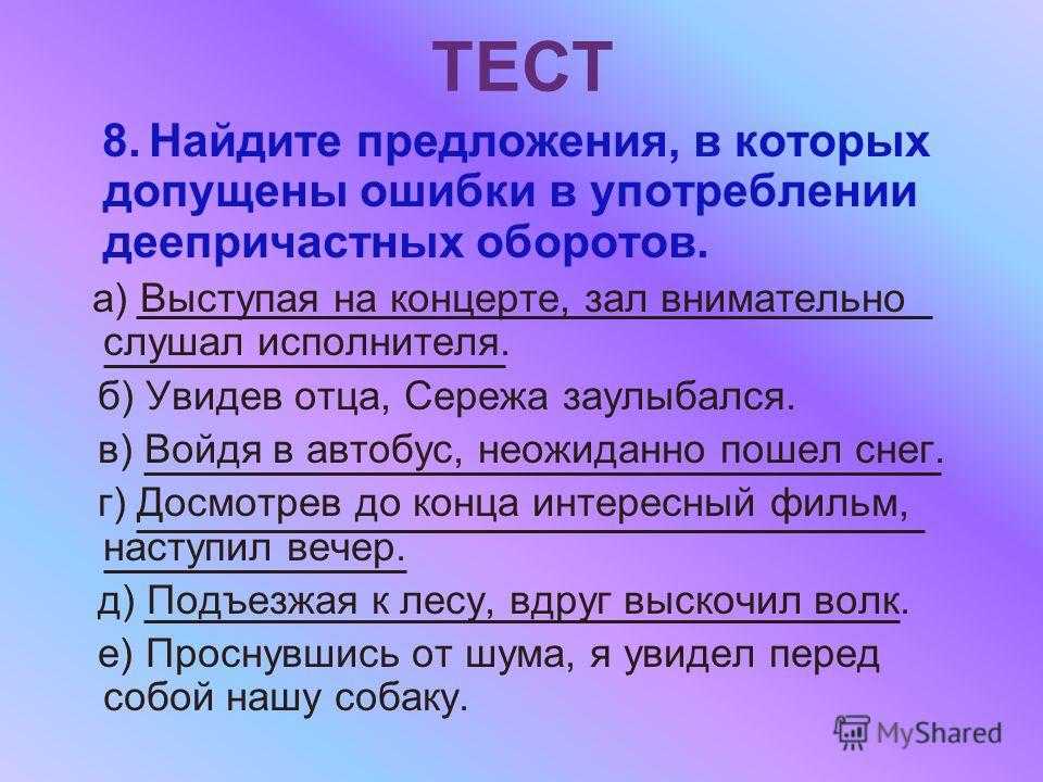 ТЕСТ 8. Найдите предложения, в которых допущены ошибки в употреблении деепричастных оборотов. а) Выступая на концерте, зал внимательно слушал исполнителя. б) Увидев отца, Сережа заулыбался. в) Войдя в автобус, неожиданно пошел снег. г) Досмотрев до конца интересный фильм, наступил вечер. д) Подъезжая к лесу, вдруг выскочил волк. е) Проснувшись от шума, я увидел перед собой нашу собаку.