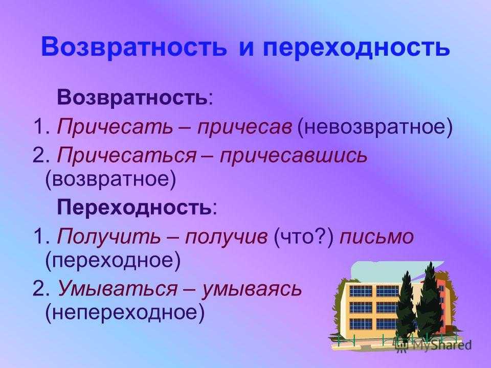Возвратность и переходность Возвратность: 1. Причесать – причесав (невозвратное) 2. Причесаться – причесавшись (возвратное) Переходность: 1. Получить – получив (что?) письмо (переходное) 2. Умываться – умываясь (непереходное)