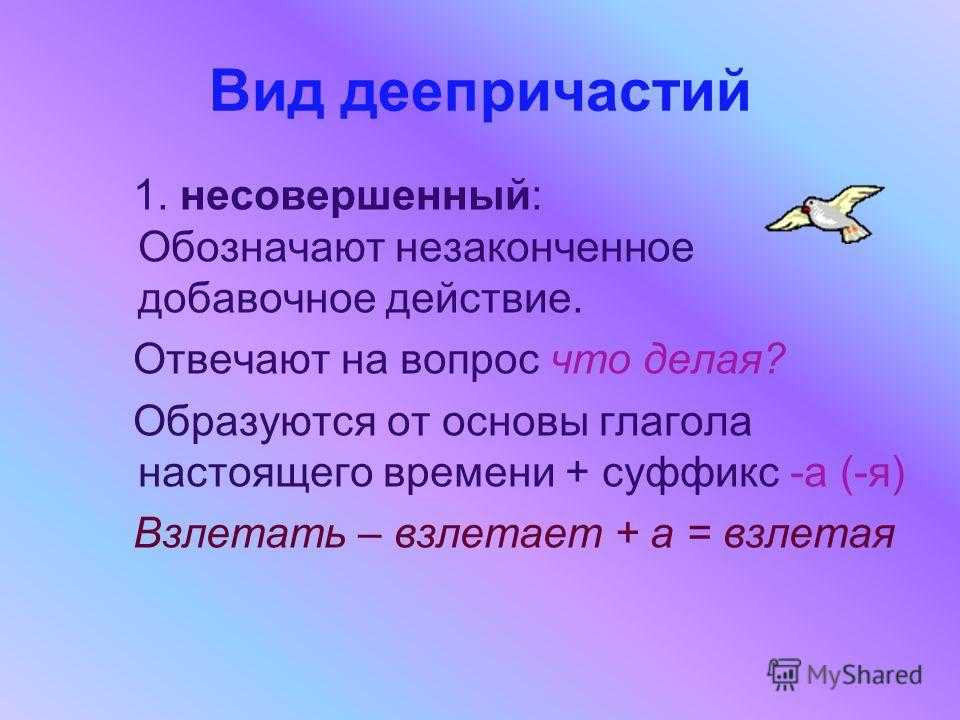 Вид деепричастий 1. несовершенный: Обозначают незаконченное добавочное действие. Отвечают на вопрос что делая? Образуются от основы глагола настоящего времени + суффикс -а (-я) Взлетать – взлетает + а = взлетая