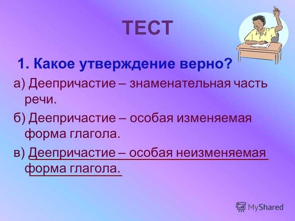 ТЕСТ 1. Какое утверждение верно? а) Деепричастие – знаменательная часть речи. б) Деепричастие – особая изменяемая форма глагола. в) Деепричастие – особая неизменяемая форма глагола.