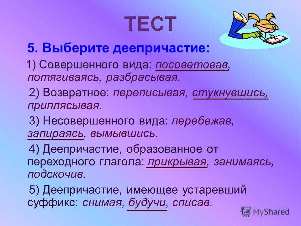ТЕСТ 5. Выберите деепричастие: 1) Совершенного вида: посоветовав, потягиваясь, разбрасывая. 2) Возвратное: переписывая, стукнувшись, приплясывая. 3) Несовершенного вида: перебежав, запираясь, вымывшись. 4) Деепричастие, образованное от переходного глагола: прикрывая, занимаясь, подскочив. 5) Деепричастие, имеющее устаревший суффикс: снимая, будучи, списав.