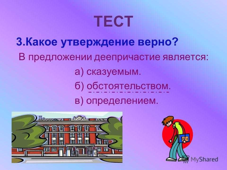ТЕСТ 3.Какое утверждение верно? В предложении деепричастие является: а) сказуемым. б) обстоятельством. в) определением.