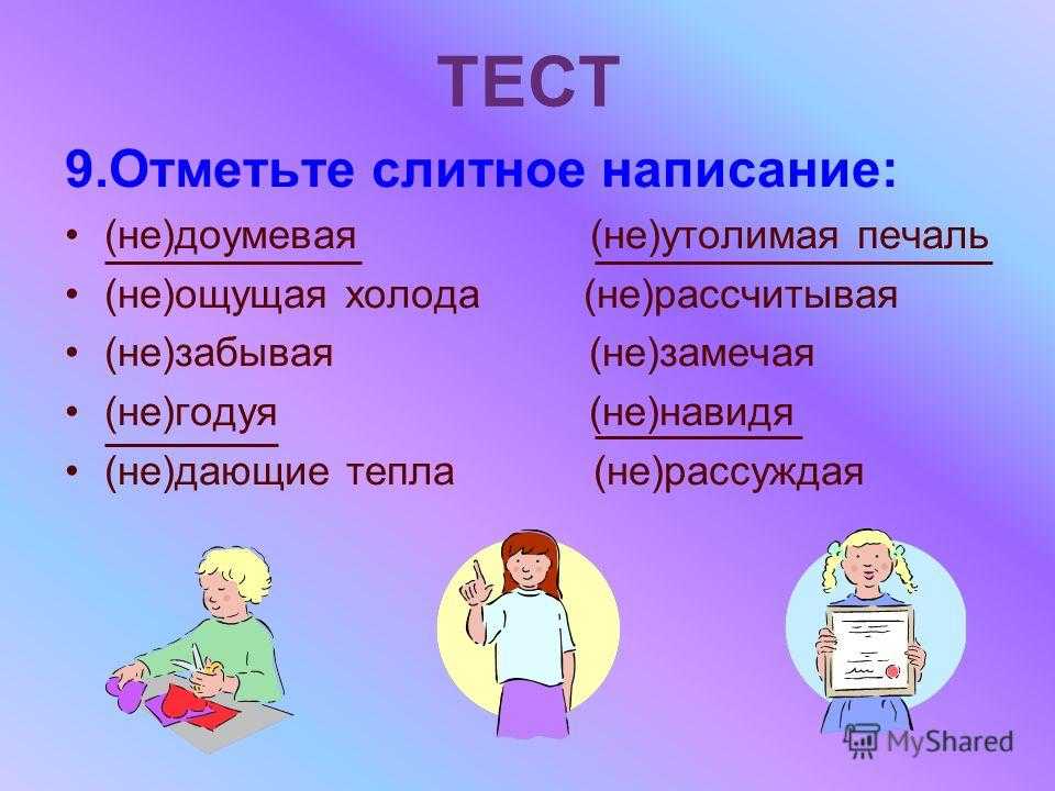 ТЕСТ 9.Отметьте слитное написание: (не)доумевая (не)утолимая печаль (не)ощущая холода (не)рассчитывая (не)забывая (не)замечая (не)годуя (не)навидя (не)дающие тепла (не)рассуждая