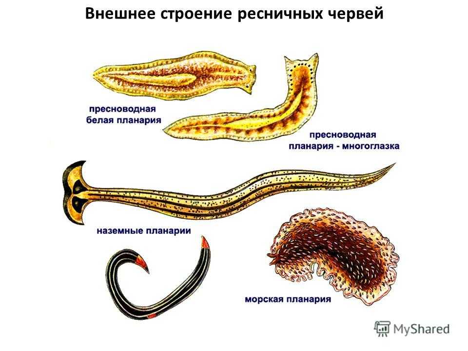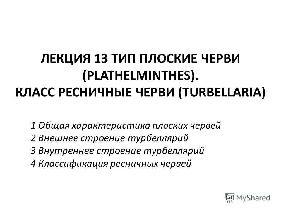 ЛЕКЦИЯ 13 ТИП ПЛОСКИЕ ЧЕРВИ (PLATHELMINTHES). КЛАСС РЕСНИЧНЫЕ ЧЕРВИ (TURBELLARIA) 1 Общая характеристика плоских червей 2 Внешнее строение турбеллярий 3 Внутреннее строение турбеллярий 4 Классификация ресничных червей