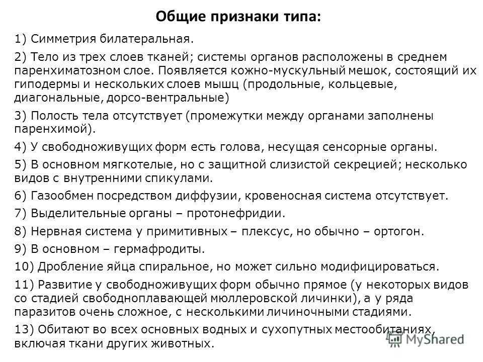 Общие признаки типа: 1) Симметрия билатеральная. 2) Тело из трех слоев тканей; системы органов расположены в среднем паренхиматозном слое. Появляется кожно-мускульный мешок, состоящий их гиподермы и нескольких слоев мышц (продольные, кольцевые, диагональные, дорсо-вентральные) 3) Полость тела отсутствует (промежутки между органами заполнены паренхимой). 4) У свободноживущих форм есть голова, несущая сенсорные органы. 5) В основном мягкотелые, но с защитной слизистой секрецией; несколько видов с внутренними спикулами. 6) Газообмен посредством диффузии, кровеносная система отсутствует. 7) Выделительные органы – протонефридии.