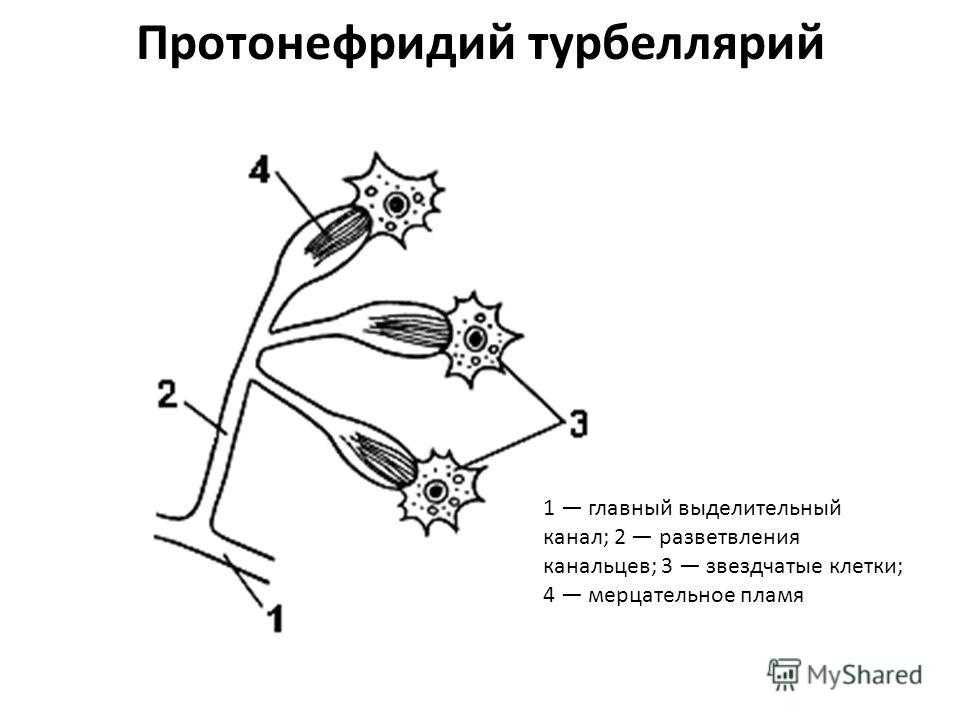 Протонефридий турбеллярий 1 главный выделительный канал; 2 разветвления канальцев; 3 звездчатые клетки; 4 мерцательное пламя