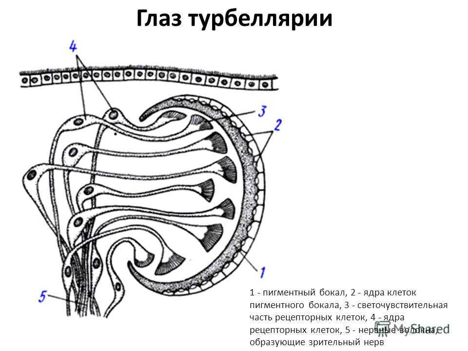 Глаз турбеллярии 1 — пигментный бокал, 2 — ядра клеток пигментного бокала, 3 — светочувствительная часть рецепторных клеток, 4 — ядра рецепторных клеток, 5 — нервные волокна, образующие зрительный нерв