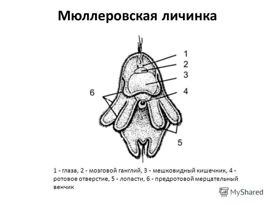 Мюллеровская личинка 1 — глаза, 2 — мозговой ганглий, 3 — мешковидный кишечник, 4 — ротовое отверстие, 5 — лопасти, 6 — предротовой мерцательный венчик