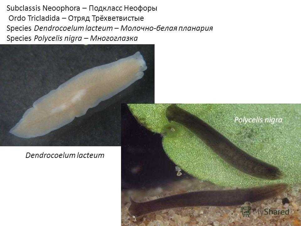 Subclassis Neoophora – Подкласс Неофоры Ordo Tricladida – Отряд Трёхветвистые Species Dendrocoelum lacteum – Молочно-белая планария Species Polycelis nigra – Многоглазка Dendrocoelum lacteum Polycelis nigra